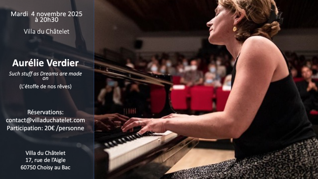 Programme présenté par la pianiste, entrecoupé de quelques lectures. (Durée 1h15 environ)Originaire de la région de Nice, la pianiste Aurélie Verdier est diplômée de l’Académie de Musique de Monaco, et du Cefedem-Sud d’Aubagne. Parallèlement à son cursus musical et pédagogique, elle suit des études en langues vivantes et philosophie en classes préparatoires littéraires et à l’université Paris X Nanterre, où elle obtient une double équivalence de DEUG en Anglais et en Philosophie. Cette particularité fait d’elle une artiste en quête constante de lien entre la musique et les autres arts, plaçant la réflexion et l’échange avec le public au centre de ses programmations musicales. Lauréate de la Fondation Turquois, de la SOGEDA, et de la Fondation Princesse Grace de Monaco, son parcours riche et singulier l’amène à se former en France, aux Etats-Unis et au Mexique, où elle a pu bénéficier des conseils de pianistes et professeurs de renom, dont Laurent Cabasso, Johan Schmidt, Virginia Weckstrom, Jean-Claude Vanden Eynden, Hugues Leclère, Florence Paumier et Bernard Zoccola.